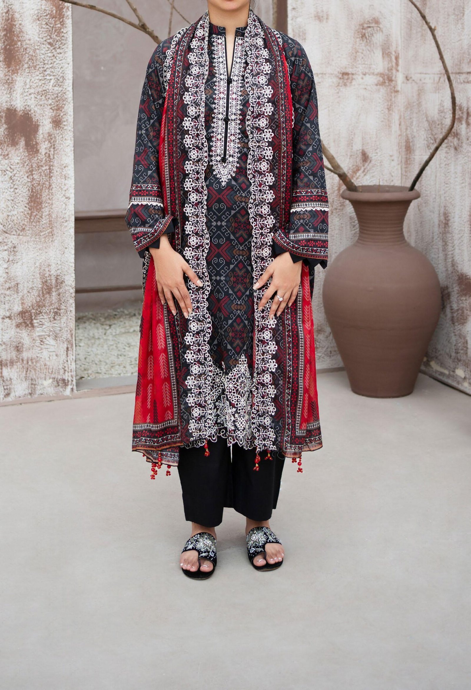 Each suit includes a luxury digital printed Chikankari embroidered lawn shirt, a premium dyed lawn trouser, and a digital printed embroidered cutwork lawn dupatta, ensuring a complete and attractive summer outfit.