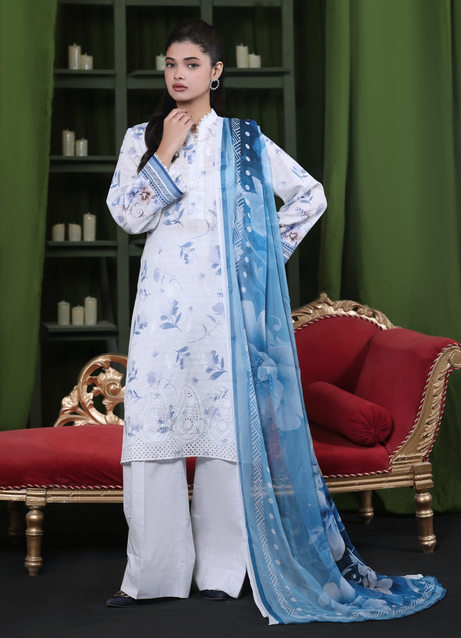 Each suit includes a beautifully embroidered Lawnkari lawn shirt, paired with a digitally printed Bamber chiffon dupatta that enhances the overall festive look. The outfit is completed with a dyed cambric trouser, ensuring comfort for summer wear.